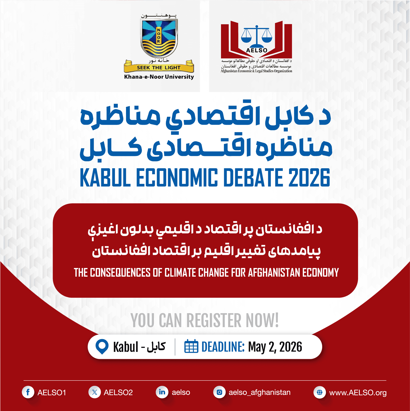 The Afghanistan Economic and Legal Studies Organization (AELSO), in collaboration with Khana-e-Noor University, is organizing the Kabul Economic Debate on the theme: “The Consequences of Climate Change for Afghanistan’s Economy.”